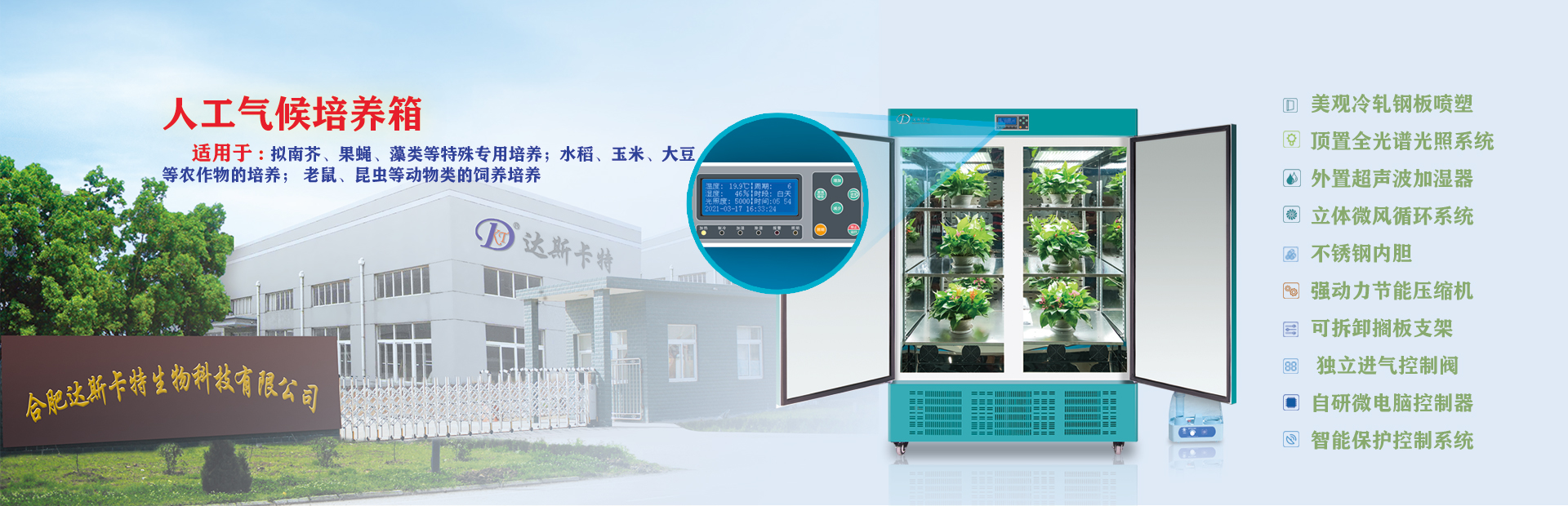合肥達(dá)斯卡特生物科技有限公司前身是合肥華德利科學(xué)器材有限公司,擁有自足品牌“達(dá)斯卡特”。本公司是專業(yè)研發(fā)、生產(chǎn)制造、技術(shù)服務(wù)及市場營銷為一體的實(shí)業(yè)公司。公司自主研發(fā)的各類規(guī)格的干燥箱系列、恒溫箱系列、生化培養(yǎng)箱系列、光照培養(yǎng)箱系列、人工氣候箱系列、恒溫恒濕箱系列、二氧化碳人工氣候箱系列、低溫培養(yǎng)箱系列、超低溫保存箱系列、搖床系列、人工氣候室、植物生長室、冷庫、潔凈室等實(shí)驗(yàn)室儀器設(shè)備及工程項(xiàng)目,特別是實(shí)驗(yàn)室箱體類的產(chǎn)品目前擁有二十八大類、五十多個(gè)品種、八十多個(gè)規(guī)格、近三百多個(gè)型號。